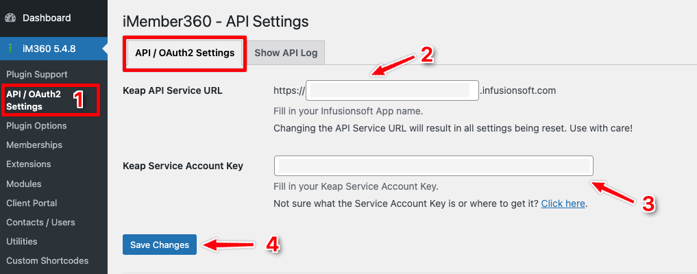 Connect iMember360 to your Keap account by entering your Service Account credentials.